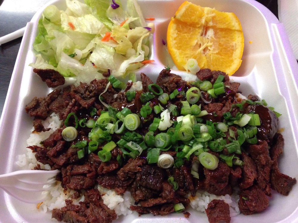 Beef Teriyaki over Stir-Fried Japanese Style Chow Mein and Vegetables. Served with Salad and Slice of Orange.