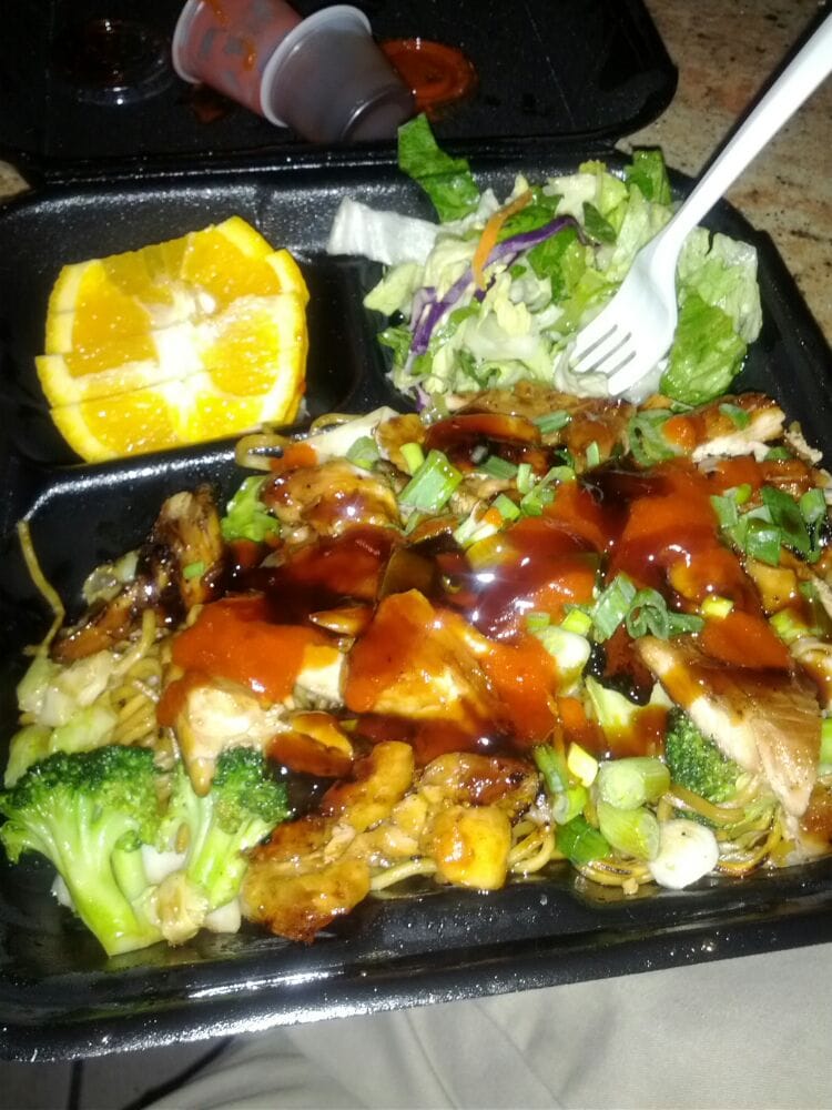 Chicken and Beef Teriyaki over Stir-Fried Japanese Style Chow Mein and Vegetables. Served with Salad and Slice of Orange.